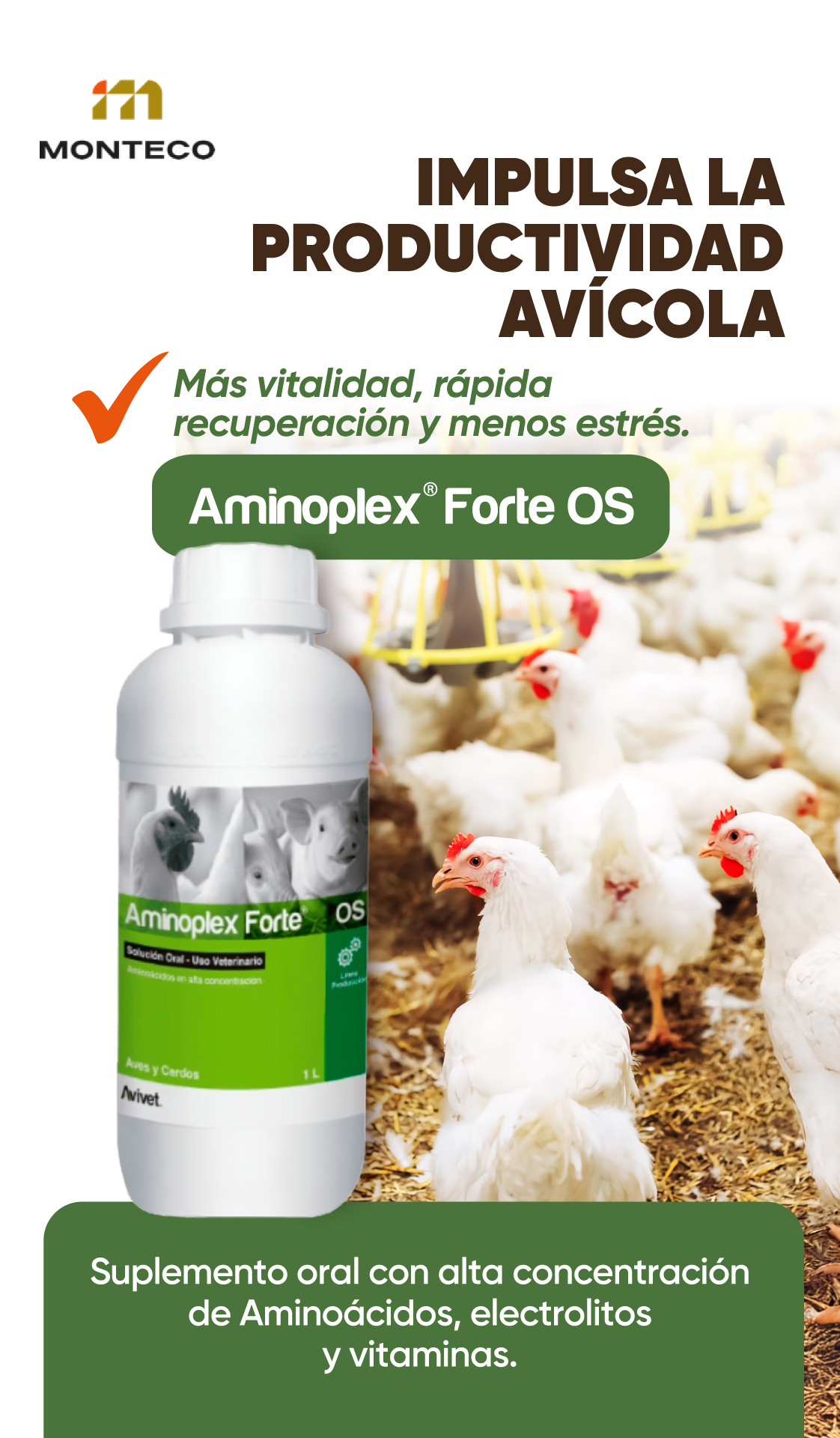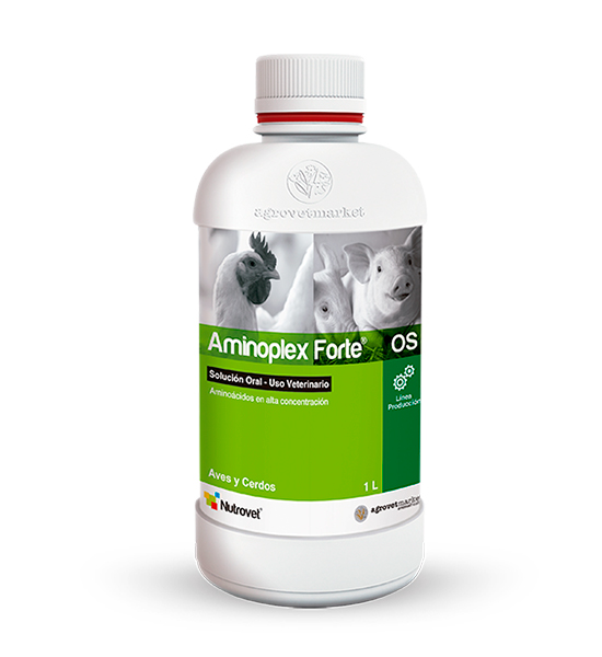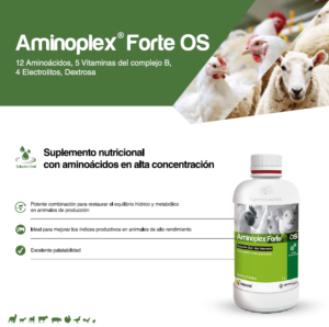 Aminoplex Forte OS es un suplemento nutricional oral en solución formulado con aminoácidos esenciales, vitaminas del complejo B, dextrosa y electrolitos. Se utiliza para reponer carencias proteicas y energéticas en animales con deficiencias alimentarias, estados de convalecencia o estrés metabólico.