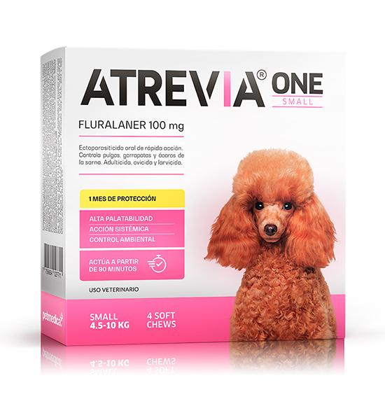 Atrevia One Small es un antiparasitario oral de acción sistémica diseñado para perros pequeños con peso entre 5 y 10 kg, proporcionando una dosificación precisa de fluralaner para el control eficaz y sostenido de pulgas, garrapatas y ácaros con una protección hasta por 30 días.