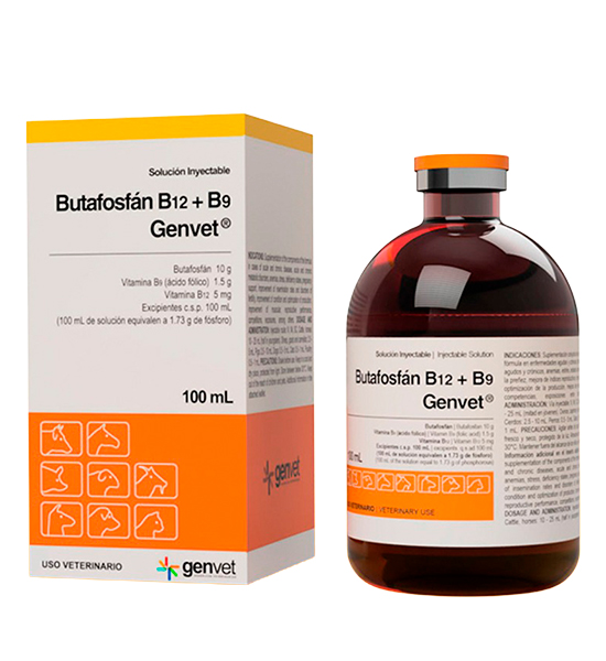 Butafosfán B12 + B9 es una solución inyectable que combina fósforo orgánico (butafosfán) con vitamina B12 (cianocobalamina) y vitamina B9 (ácido fólico). Está indicada como suplemento metabólico en situaciones de mayor demanda fisiológica.