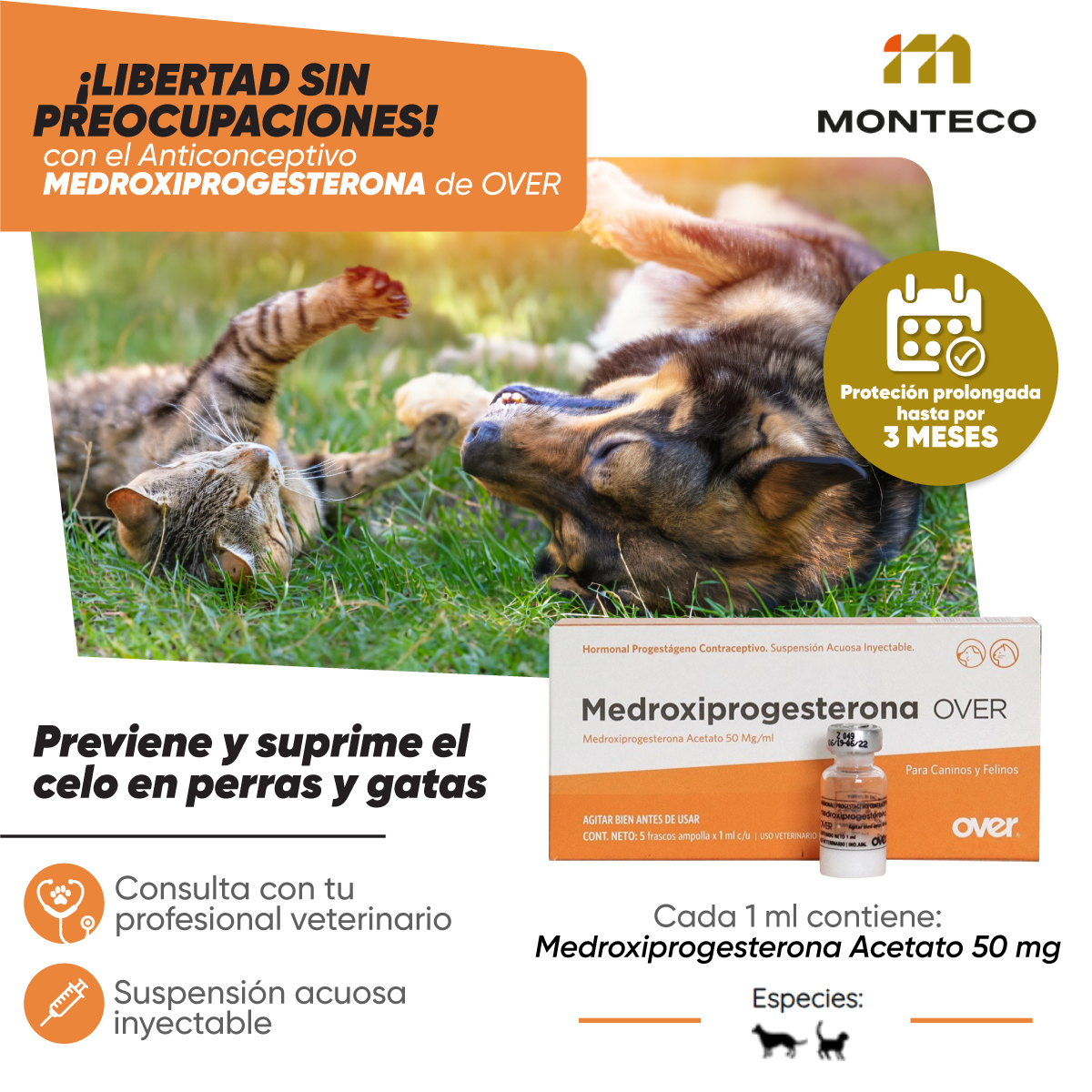 Medroxiprogesterona es un anticonceptivo hormonal inyectable para perras y gatas indicado para prevenir o postergar el celo de forma temporal. Se utiliza cuando se desea evitar gestaciones no planificadas sin recurrir a una esterilización quirúrgica inmediata.