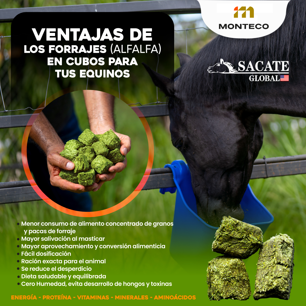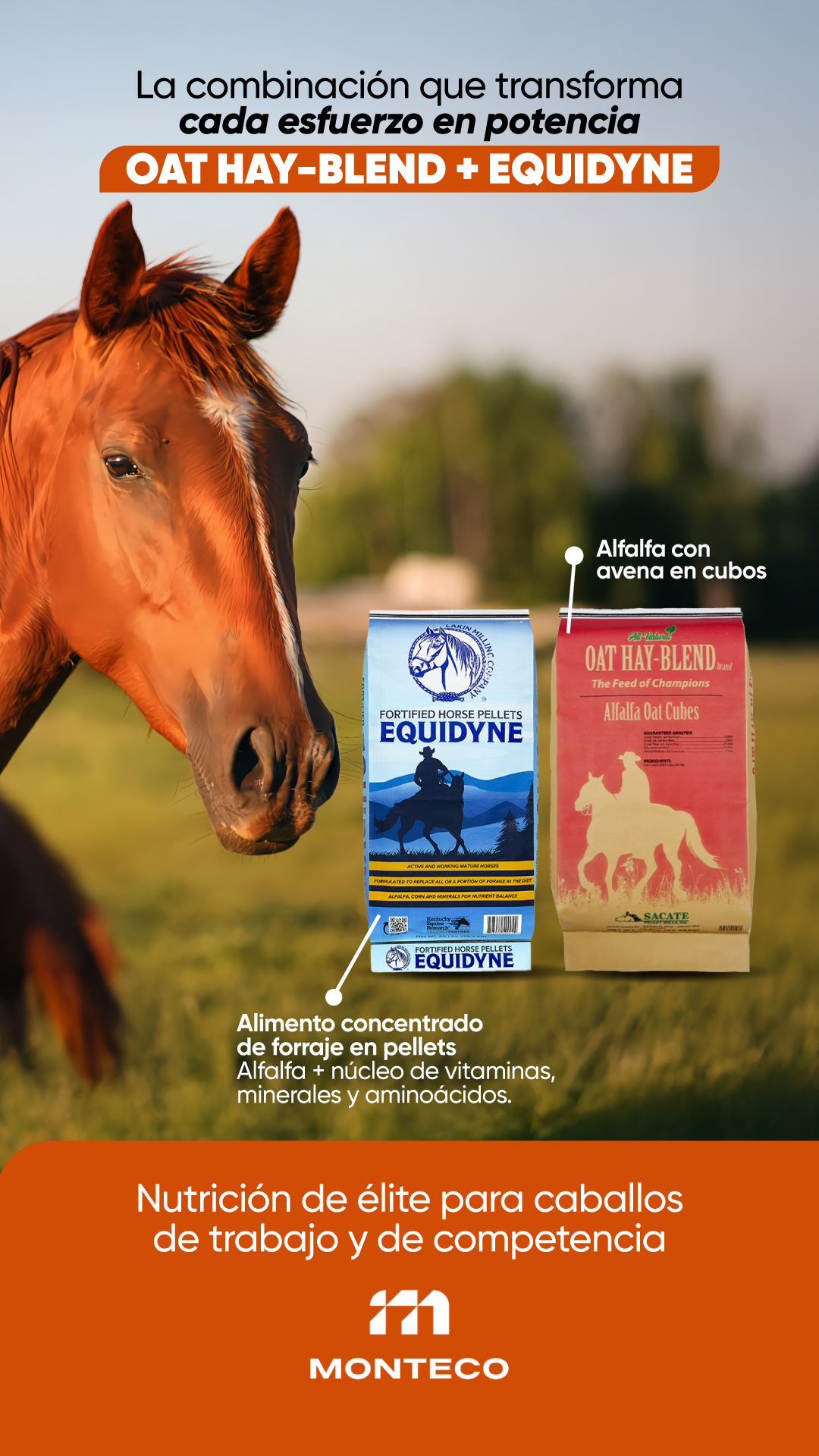 La alfalfa aporta proteína y minerales esenciales que apoyan el rendimiento y la salud muscular, mientras que la avena proporciona energía sostenida que mejora la resistencia y vitalidad del caballo.