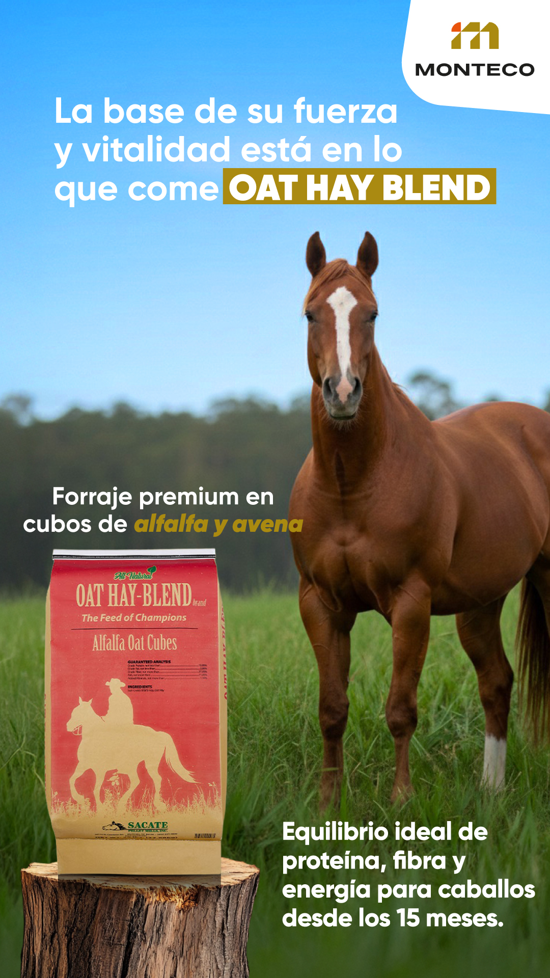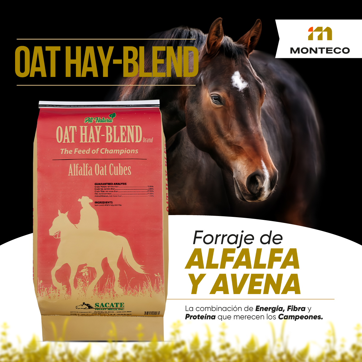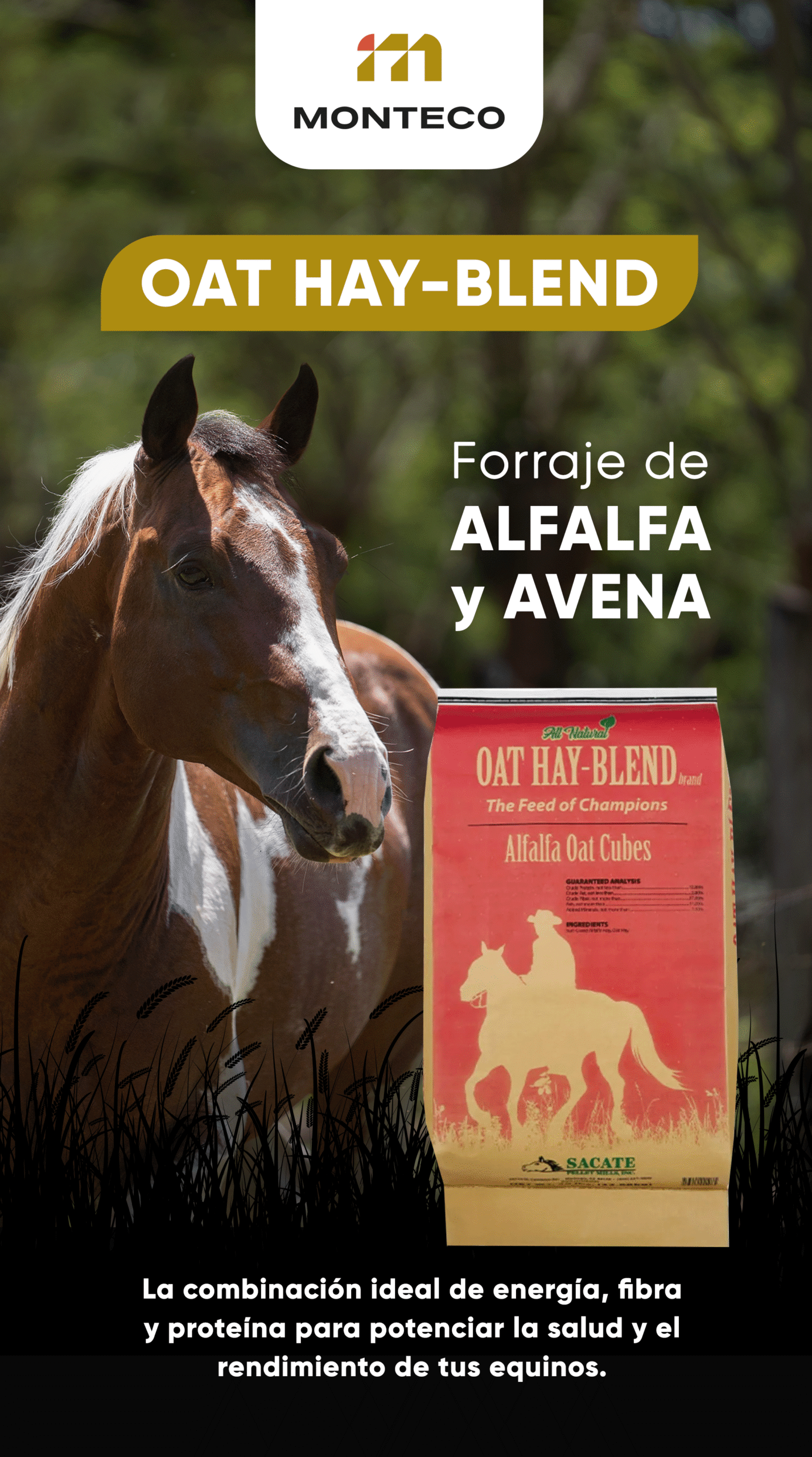 Oat Hay Blend es un forraje en cubos elaborado a partir de heno de alfalfa y avena, formulado para ofrecer una nutrición equilibrada y funcional a los caballos. Es ideal para animales en trabajo, entrenamiento o mantenimiento.