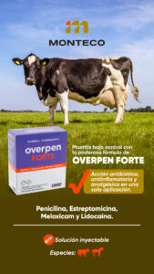 Overpen Forte es un antibiótico inyectable de acción combinada que ofrece una triple acción terapéutica: antibiótica, antiinflamatoria y analgésica. Diseñado para el tratamiento de infecciones bacterianas en bovinos y equinos, actúa eficazmente contra bacterias Gram positivas y Gram negativas gracias a la combinación de penicilinas y estreptomicina. El meloxicam, como antiinflamatorio no esteroide, reduce el dolor y la inflamación asociados al proceso infeccioso, mientras que la lidocaína incluida en el diluyente mejora el confort al momento de la aplicación.