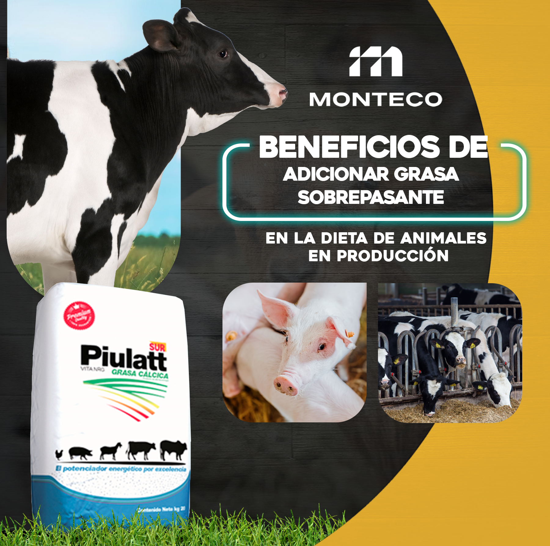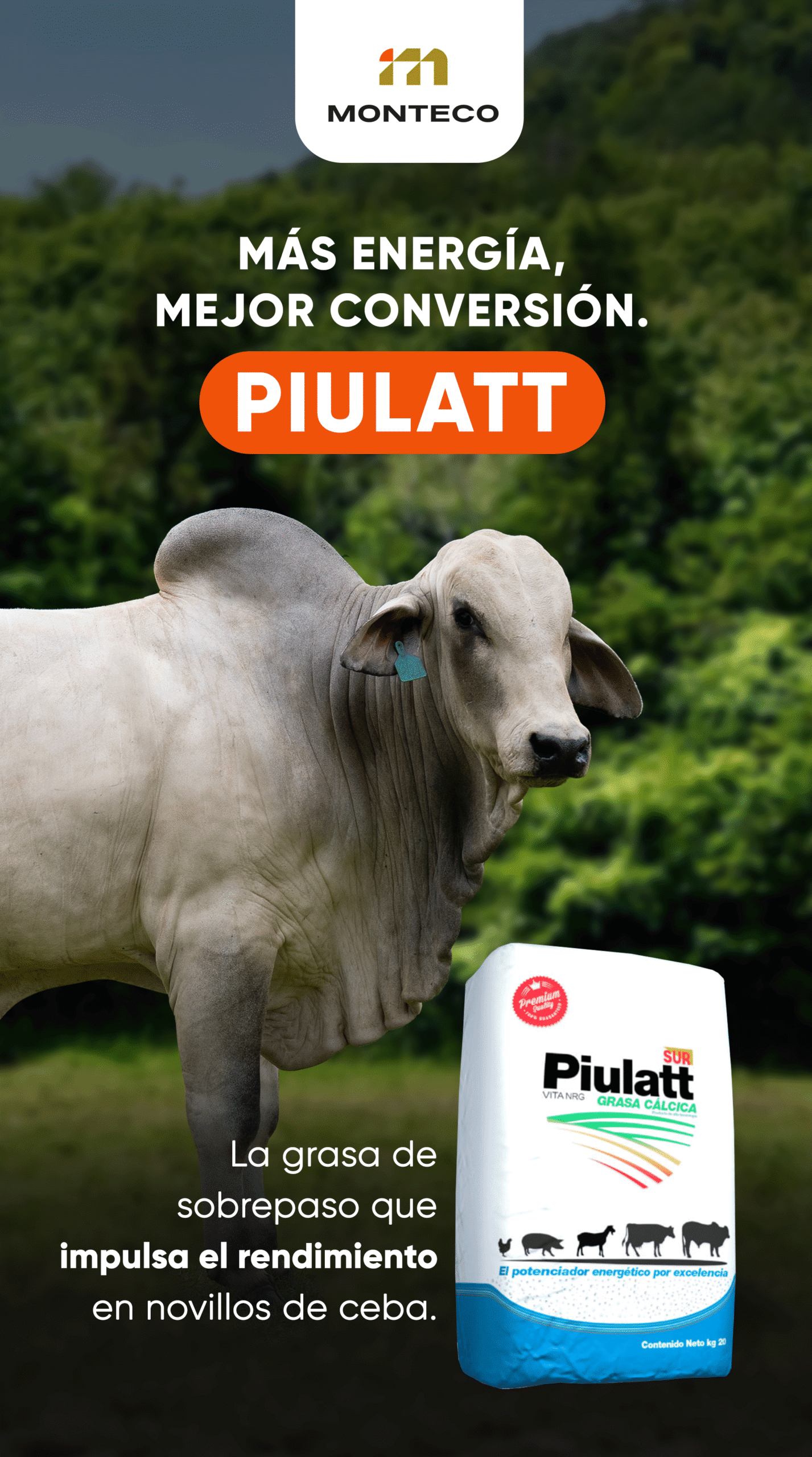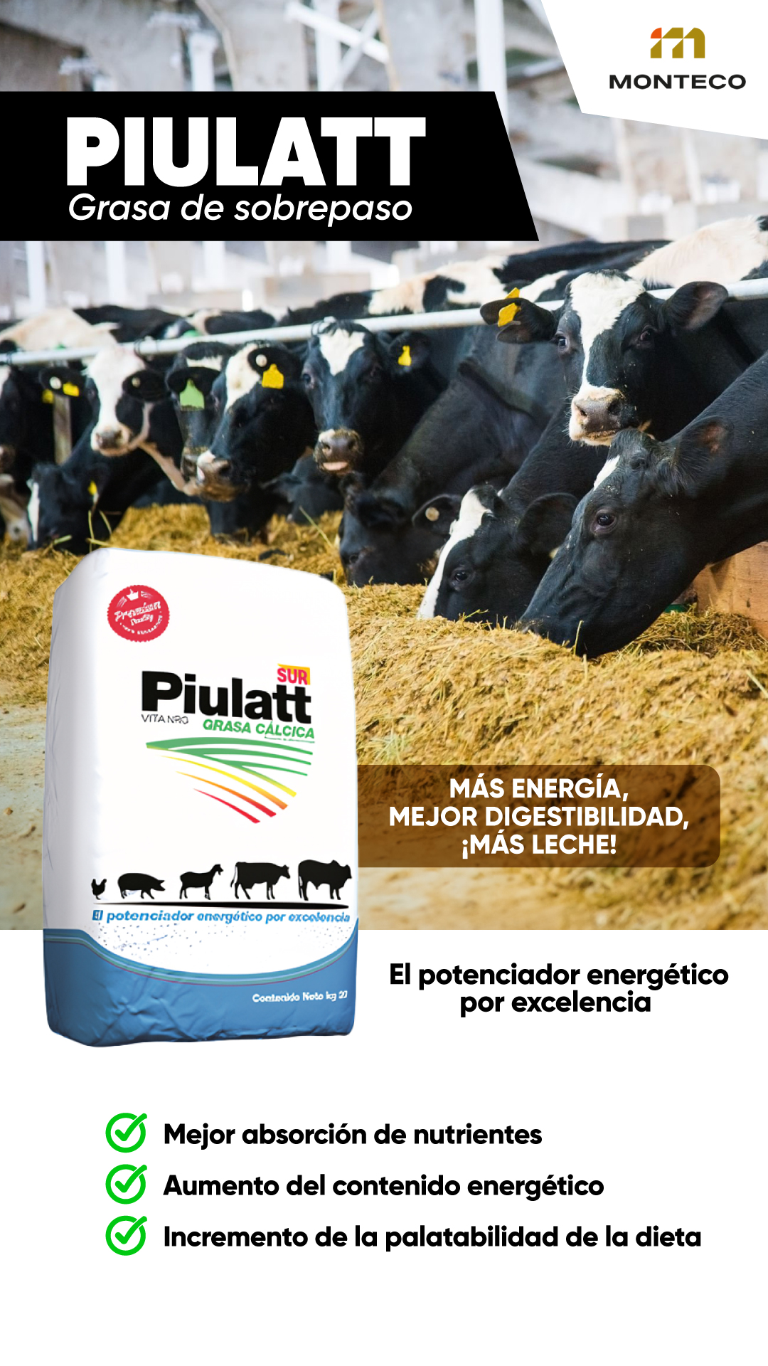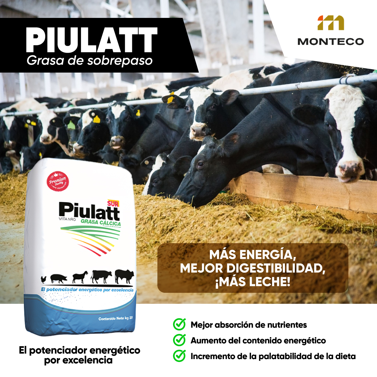 Piulatt es una grasa de sobrepaso (jabón cálcico) de alto valor energético y digestibilidad para la alimentación de rumiantes. Mejora los niveles de producción, posee una larga estabilidad con poca rancidez, alta palatabilidad y un agradable olor. Fuente de energía de rápida y fácil absorción, su presentación granulada mejora la fluidez de la mezcla y favorece el tránsito desde el rumen hasta el intestino, asegurando una mejor asimilación de los nutrientes y potenciando la energía del animal.