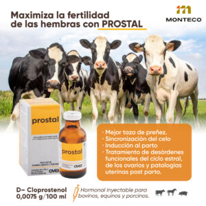 Prostal es un producto hormonal formulado a base de D (+) cloprostenol, un análogo sintético de la prostaglandina F2 alfa. Está indicado para sincronizar celos, mejorar los ciclos reproductivos y aumentar las tasas de preñez en bovinos, equinos y porcinos. Además, es útil en el manejo de desórdenes funcionales del ciclo estral, inducción al parto o aborto, y en el tratamiento de patologías uterinas postparto como piómetras y endometritis.