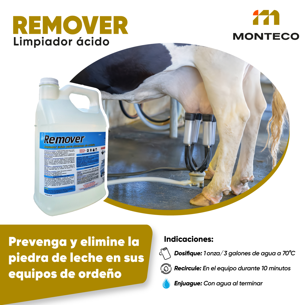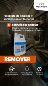 Remover es un detergente ácido especializado para la eliminación de residuos minerales y piedra de leche en equipos de ordeño, tuberías, tanques y utensilios utilizados en la producción lechera. Su acción ácida descompone eficazmente los depósitos calcáreos, garantizando una limpieza profunda y manteniendo la higiene en todo el proceso.