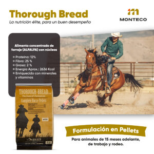 Thorough Bread es un concentrado en pellets completos de forraje de alfalfa, formulado con núcleos de vitaminas y minerales, diseñado para cubrir de forma estable y sostenida las altas demandas nutricionales de caballos de alto rendimiento.